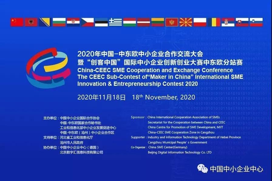 11月18日,由中國(guó)-中東歐國(guó)家合作秘書處、中國(guó)中小企業(yè)國(guó)際合作協(xié)會(huì)、工業(yè)和信息化部中小企業(yè)發(fā)展促進(jìn)中心及中國(guó)-中東歐(滄州)中小企業(yè)合作區(qū)共同主辦的“創(chuàng)客中國(guó)”國(guó)際中小企業(yè)創(chuàng)新創(chuàng)業(yè)大賽中東歐分站賽線上決賽暨中國(guó)-中東歐中小企業(yè)線上對(duì)洽會(huì)在北京隆重召開。中國(guó)中小企業(yè)中心(德國(guó))是本次會(huì)議的協(xié)辦單位。