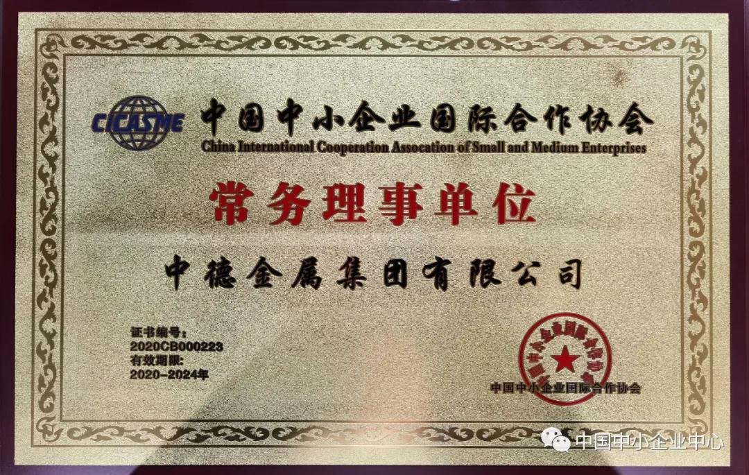 憑借在助推中小企業(yè)對外合作和創(chuàng)新發(fā)展方面的不懈努力和突出成績,中德金屬集團獲選中國中小企業(yè)國際合作協(xié)會常務(wù)理事單位,這是國家級行業(yè)協(xié)會對中德金屬集團服務(wù)中歐中小企業(yè)雙向合作工作的高度認(rèn)可,也是對集團在中小企業(yè)創(chuàng)新發(fā)展工作中突出貢獻的充分肯定,意味著中德金屬集團將更好地為國內(nèi)中小企業(yè)提供更大的合作平臺和海內(nèi)外資源。