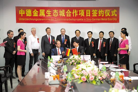 在創(chuàng)園之初,中德金屬生態(tài)城就已經(jīng)和多家來自德國的企業(yè)達(dá)成了入園投資意向。國家主席習(xí)近平訪問德國期間與德國總理默克爾共同發(fā)表《建立中德全方位戰(zhàn)略伙伴關(guān)系的聯(lián)合聲明》,并見證了中德雙邊合作文件的簽署,涉及汽車、信息化、金融、節(jié)能環(huán)保等多個(gè)領(lǐng)域。其中,來自中德金屬生態(tài)城的“中德資源再生基地”項(xiàng)目為十個(gè)簽約的經(jīng)濟(jì)項(xiàng)目中來自廣東的唯一項(xiàng)目。10月,國家總理李克強(qiáng)出訪德國柏林,與德國總理默克爾等中德政府高級官員和兩國經(jīng)濟(jì)界人士共同出席第七屆中德經(jīng)濟(jì)技術(shù)合作論壇。作為與德合作的示范企業(yè),中德金屬集團(tuán)與阿德勒斯霍夫科技園區(qū)管理機(jī)構(gòu)維斯塔公司簽署共建中德金屬生態(tài)城合作協(xié)議,與達(dá)姆施塔特工業(yè)大學(xué)IWAR研究所簽署中德金屬生態(tài)城分質(zhì)水處理及資源化利用項(xiàng)目合作協(xié)議,成為此次論壇中唯一一個(gè)成功簽約兩個(gè)項(xiàng)目的單位。