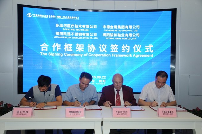市凱鏈不銹鋼、市駿和鞋業(yè)、中德金屬集團(tuán)與德國(guó)多瑙河醫(yī)療技術(shù)公司簽訂合作框架協(xié)議