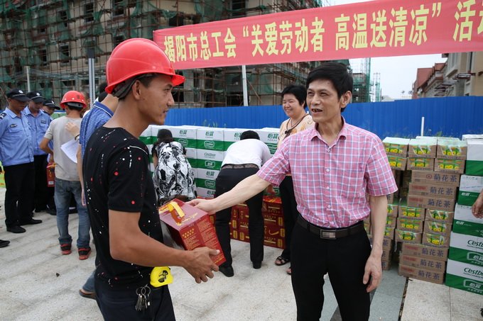立秋雖過,暑熱難退。為做好高溫期間勞動(dòng)者的服務(wù)工作,8月10日下午,揭陽市總工會走進(jìn)中德金屬生態(tài)城,開展“關(guān)愛勞動(dòng)者,高溫送清涼”活動(dòng),為奮戰(zhàn)在項(xiàng)目建設(shè)一線的職工送去解暑降溫的慰問品,傳達(dá)組織的問候與關(guān)懷之情。